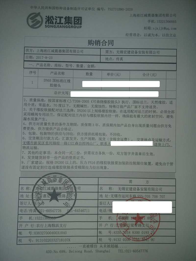 上海淞江減震器集團(tuán)有限公司為您介紹:無(wú)錫江森自控鴻山廠橡膠軟接頭合同案例信息,淞江集團(tuán)銷售在2017年8月23日簽下該合同,為無(wú)錫江森自控鴻山廠提供DN65國(guó)標(biāo)淞江橡膠軟接頭產(chǎn)品。